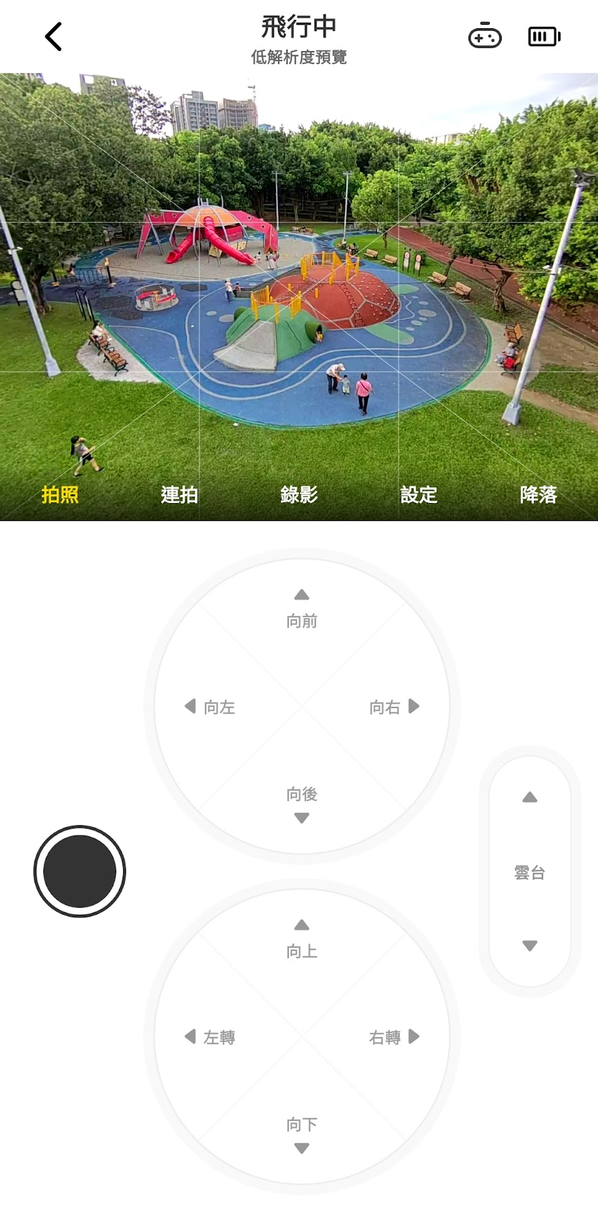 - 俯拍:以操作者為中心,垂直飛行拍攝。