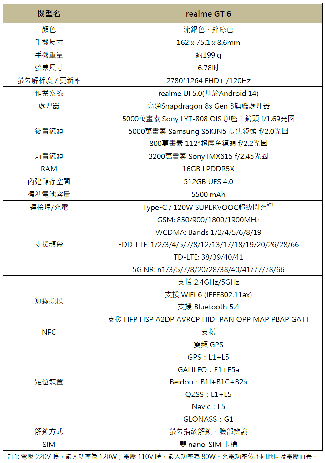 realme GT 6採用高通Snapdragon 8s Gen 3旗艦處理器,配載全球最亮6,000 尼特螢幕,更於硬體、軟體全面導入realme三大創新AI功能,包含AI極夜拍攝模式、AI傳送門、AI護眼螢幕。