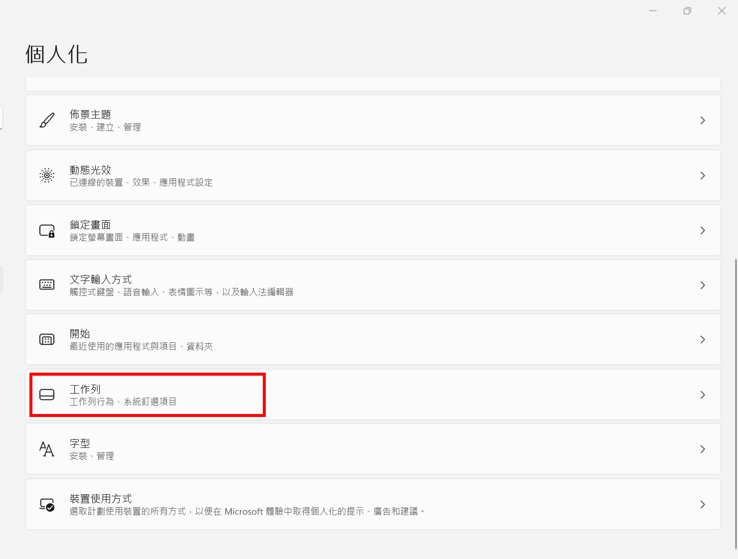 ⬆️接著拉到最下面會看見【工作列行為】點擊進入,裡面可以進行電腦主畫面下方工作列的設定。