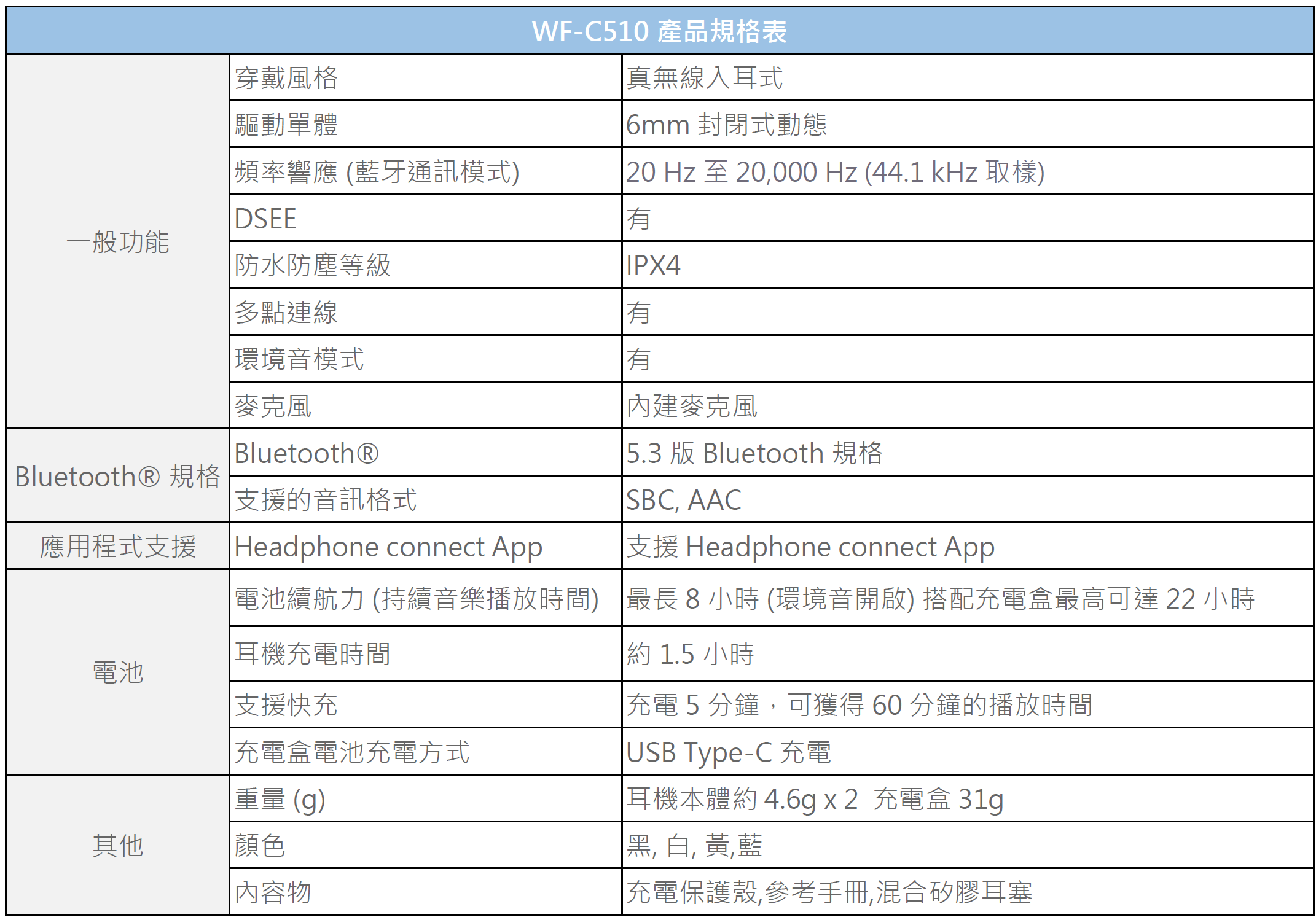 WF-C510提供長達22小時的電池續航力,並支援快速充電,充電5分鐘即可播放60分鐘;IPX4防水等級讓耳機適應各種天氣狀況,讓音樂陪伴你的每一天。