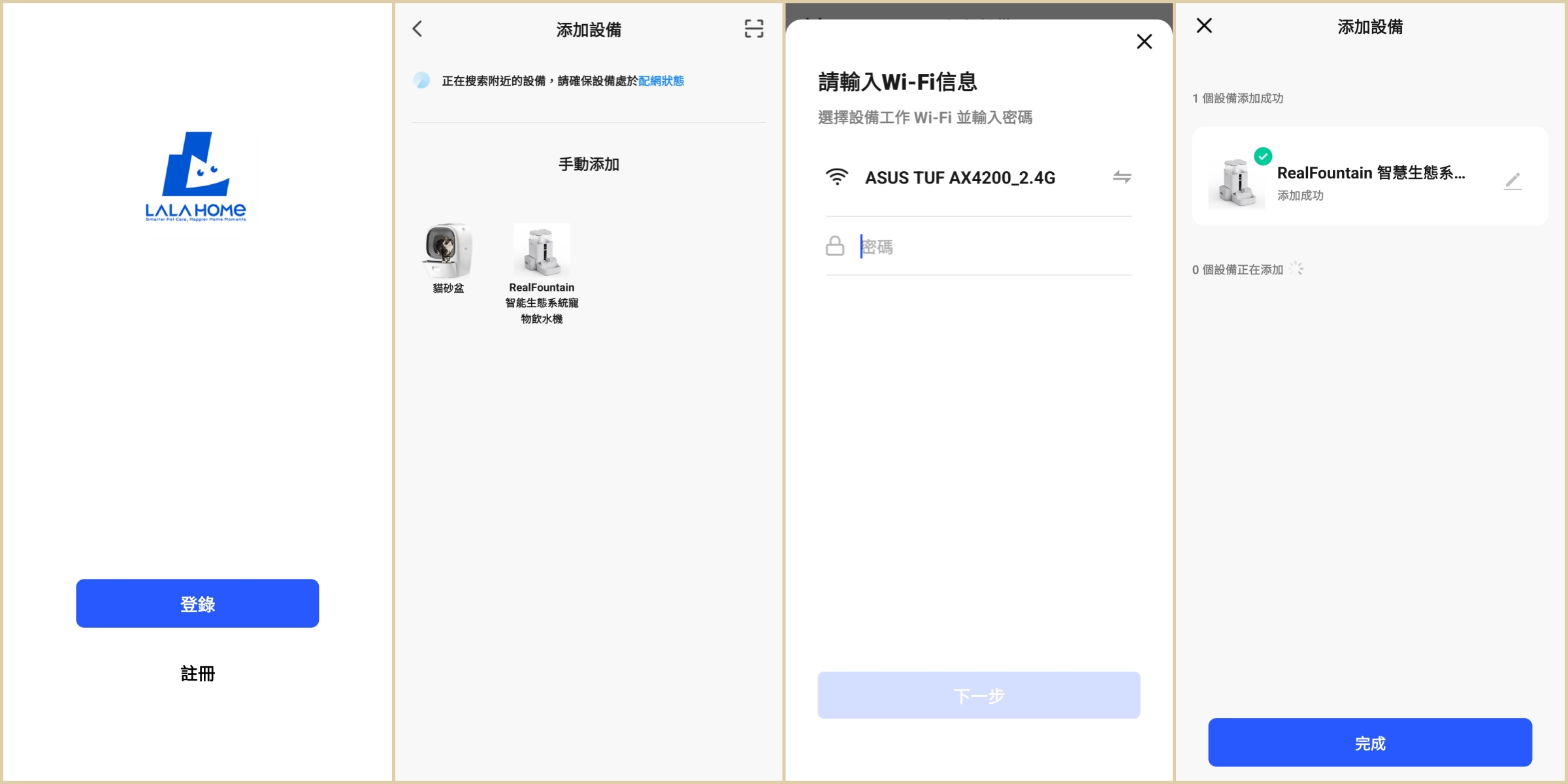 接著註冊完帳號後,就可以跟隨引導操作進行機器配對,而RealFountain 智慧生態系統寵物飲水機在無線網路的支援除了一般常見的2.4Ghz之外,也能支援更快速的5Ghz頻段,可依照每位使用者家中的配置來選擇。