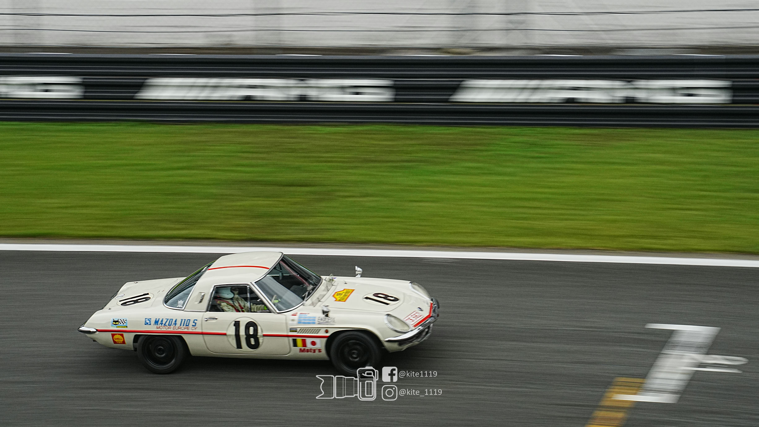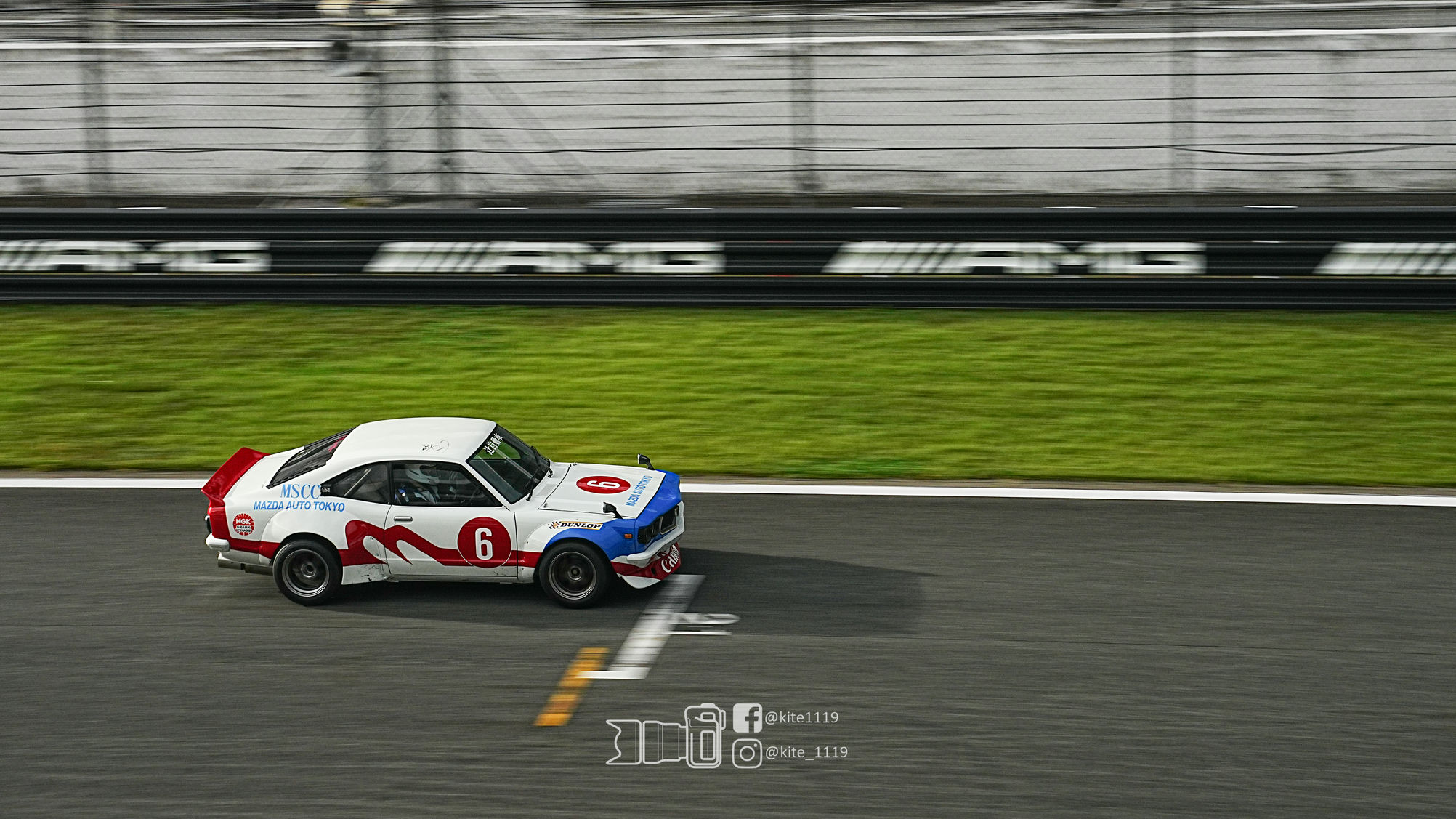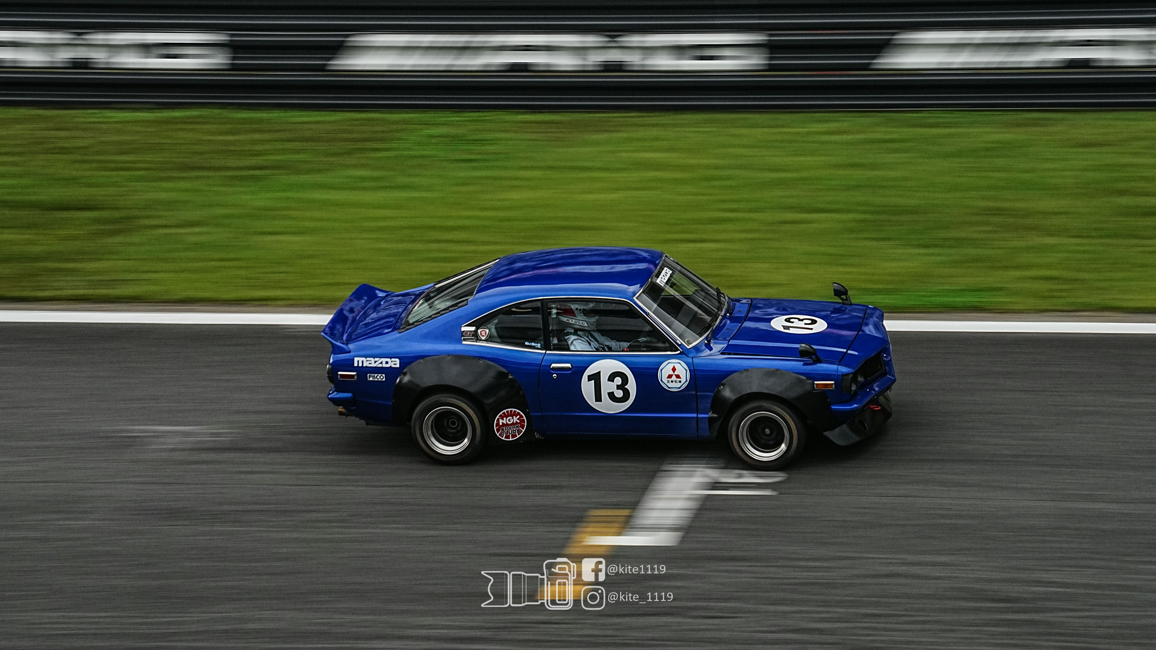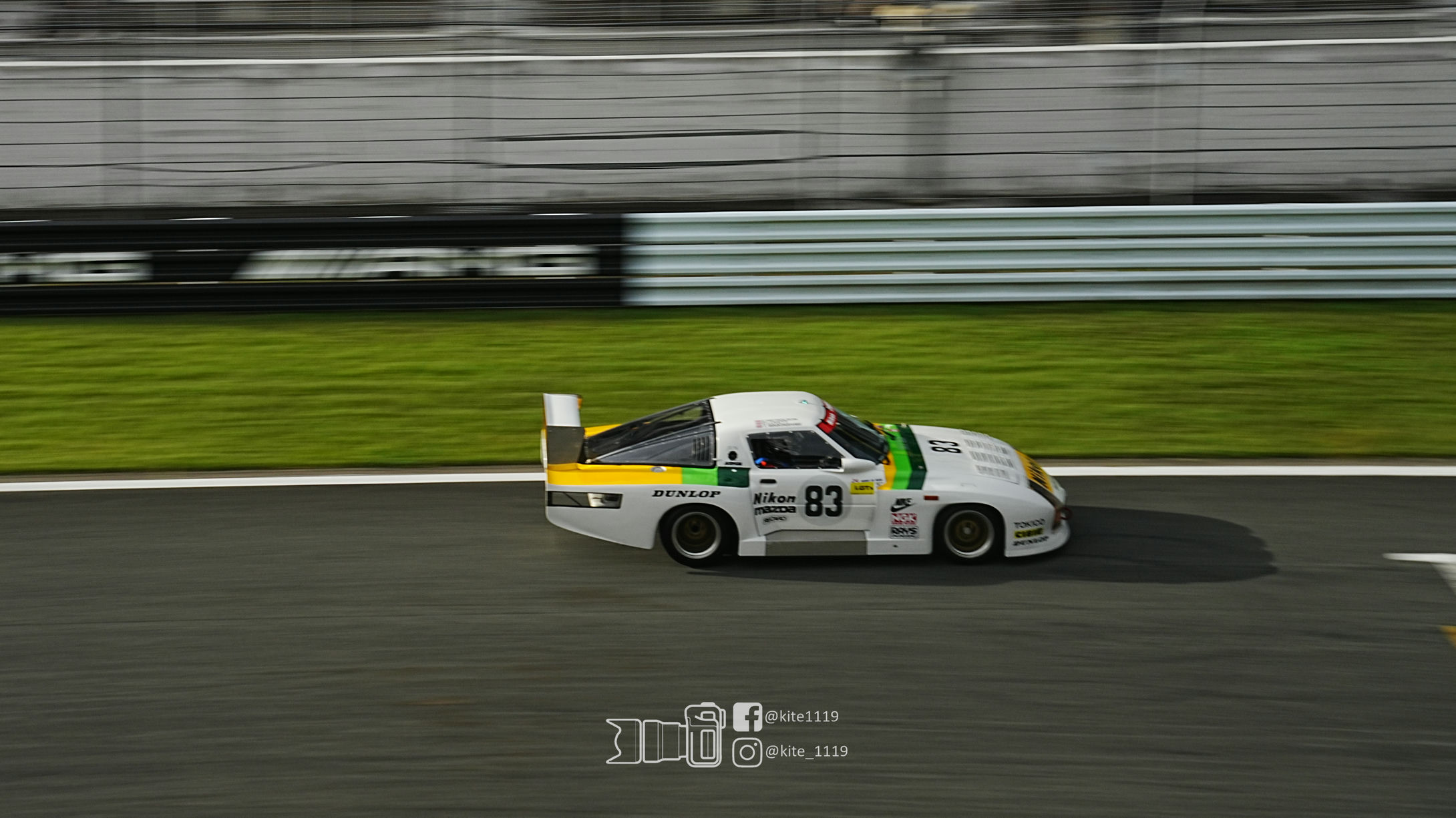 Mazda 787B在終點線的車速之快,拍了好幾次終於有一張稍微小糊的成功追焦照,另外再特別把照片的調色風格做懷舊感,有種像是看回憶紀錄片的感覺,整個心滿意足了。