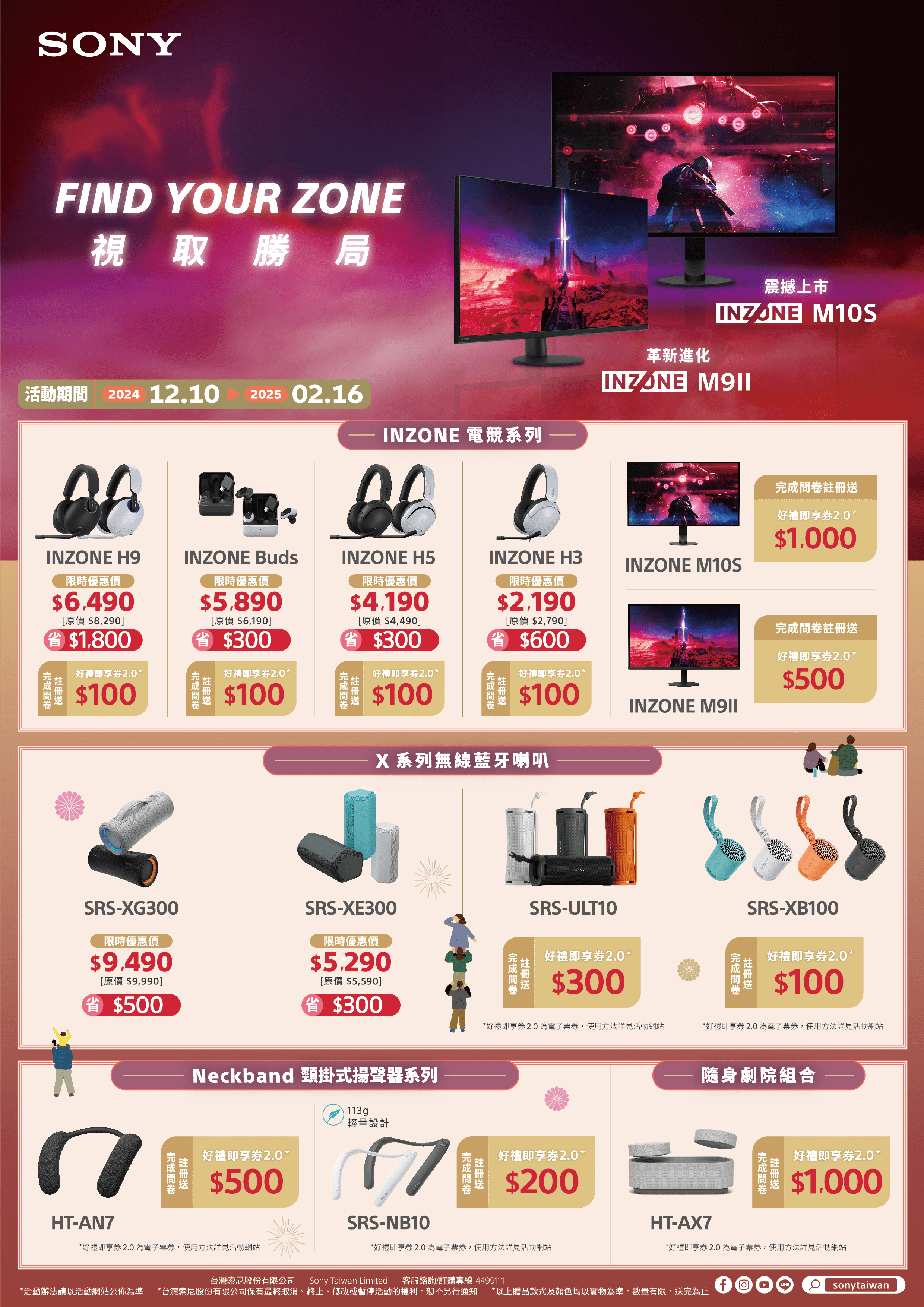 Sony 歲末優惠活動自即日起至2025/2/16止登場,詳細活動訊息請參考活動網址, 或洽詢全台Sony直營通路。