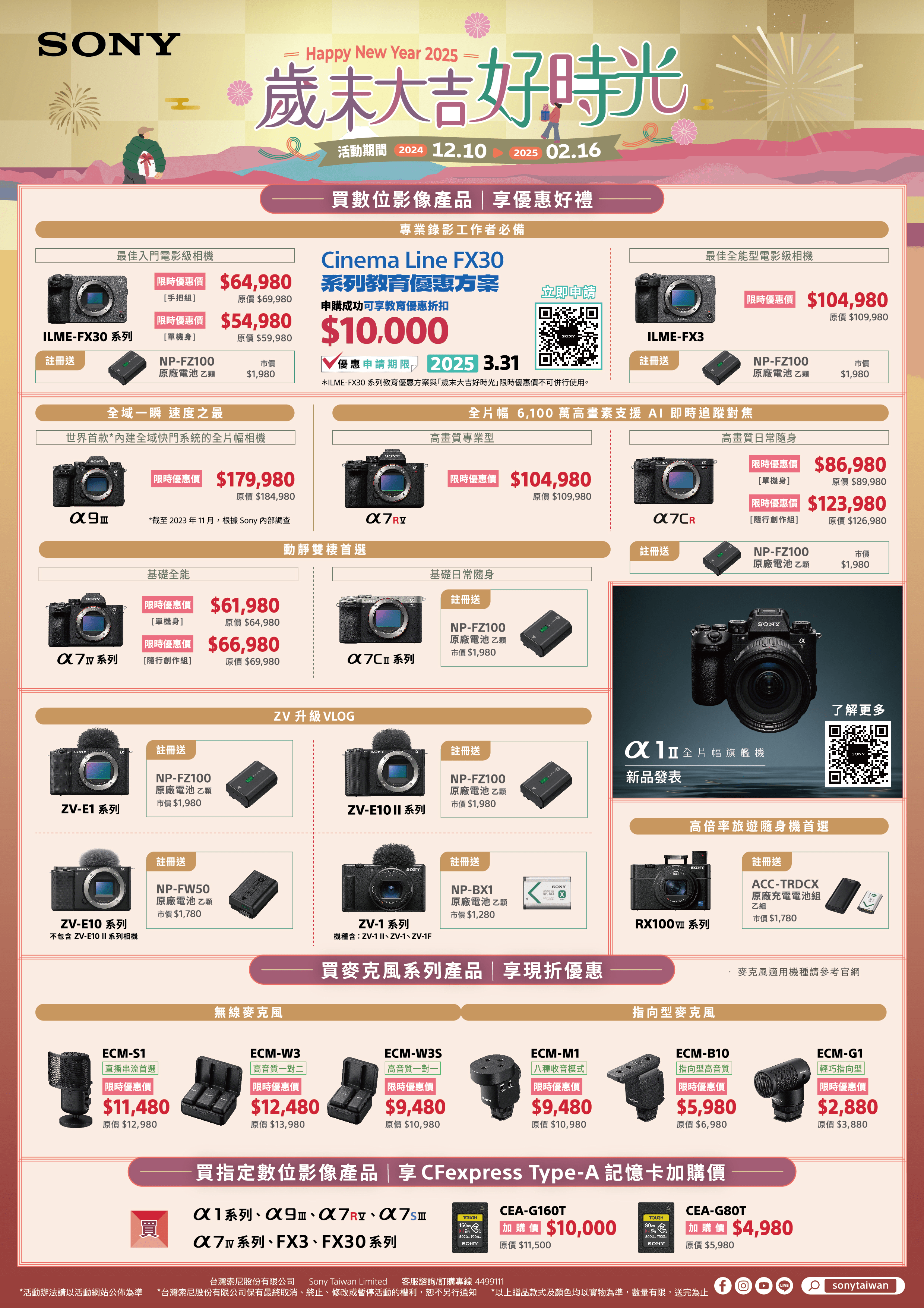 超人氣Sony 數位影像產品包含電影級數位相機FX3/FX30、全片幅相機 α 系列指定機種、Vlog相機ZV-E10/E1系列、ZV-1系列和隨身相機RX100 VII系列,則提供最高現折NT$5,000或贈送原廠電池等回饋;熱銷的 α 系列 E 接環鏡頭以及麥克風、記憶卡等配件也同享期間限定的專屬優惠,為歡樂年節假期做好萬全準備、紀錄美好精彩影像!