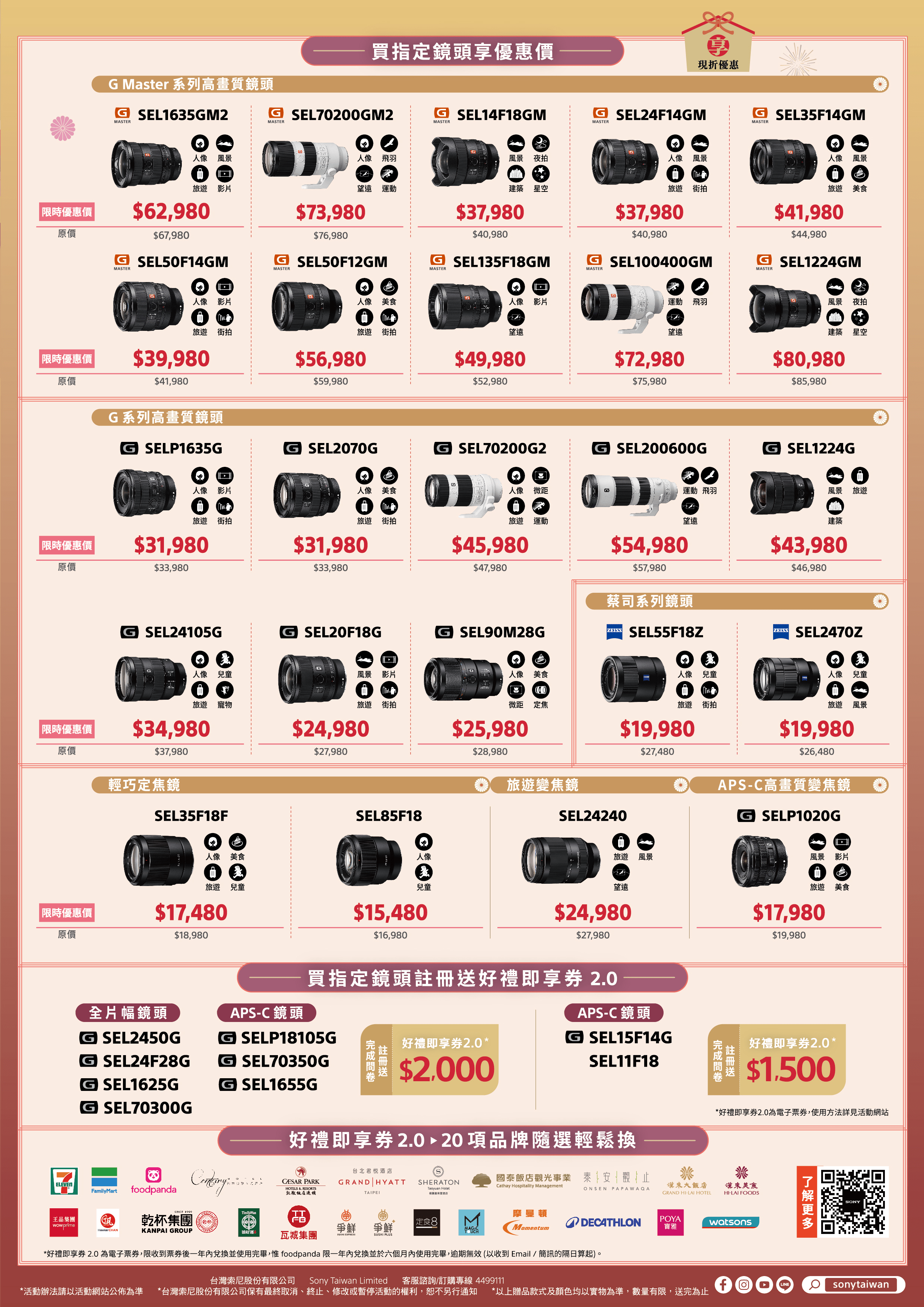 Sonyα 系列全片幅相機 指定機種、Vlog相機ZV-E10/E1系列、ZV-1系列和隨身相機RX100 VII系列,則提供最高現折NT$5,000或贈送原廠電池等回饋。