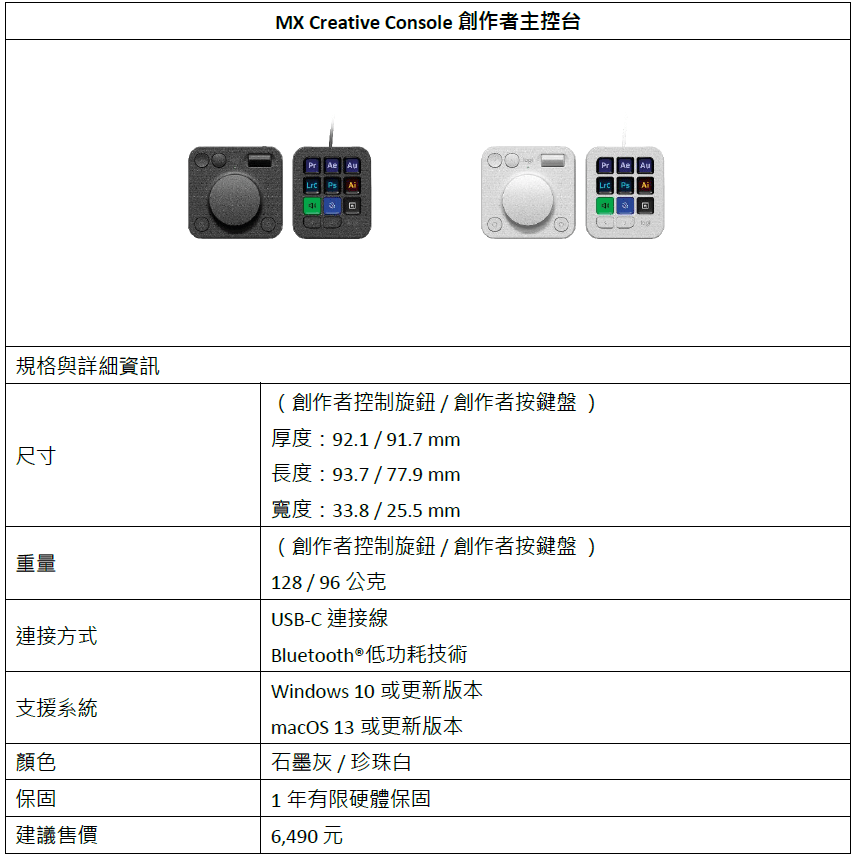 MX Creative Console 創作者主控台支援包括 Adobe Photoshop、Lightroom Classic、Premiere Pro、Audition、After Effects,以及 Zoom、Spotify 等常用軟體,預計未來將拓展至 150 款,全面整合創作體驗。產品建議售價為 6,490 元,即日起購買還可獲贈價值 5,985 元的 Adobe Creative Cloud 三個月免費授權(適用於新用戶及現有用戶,每個 Adobe 帳號限兌一次。)