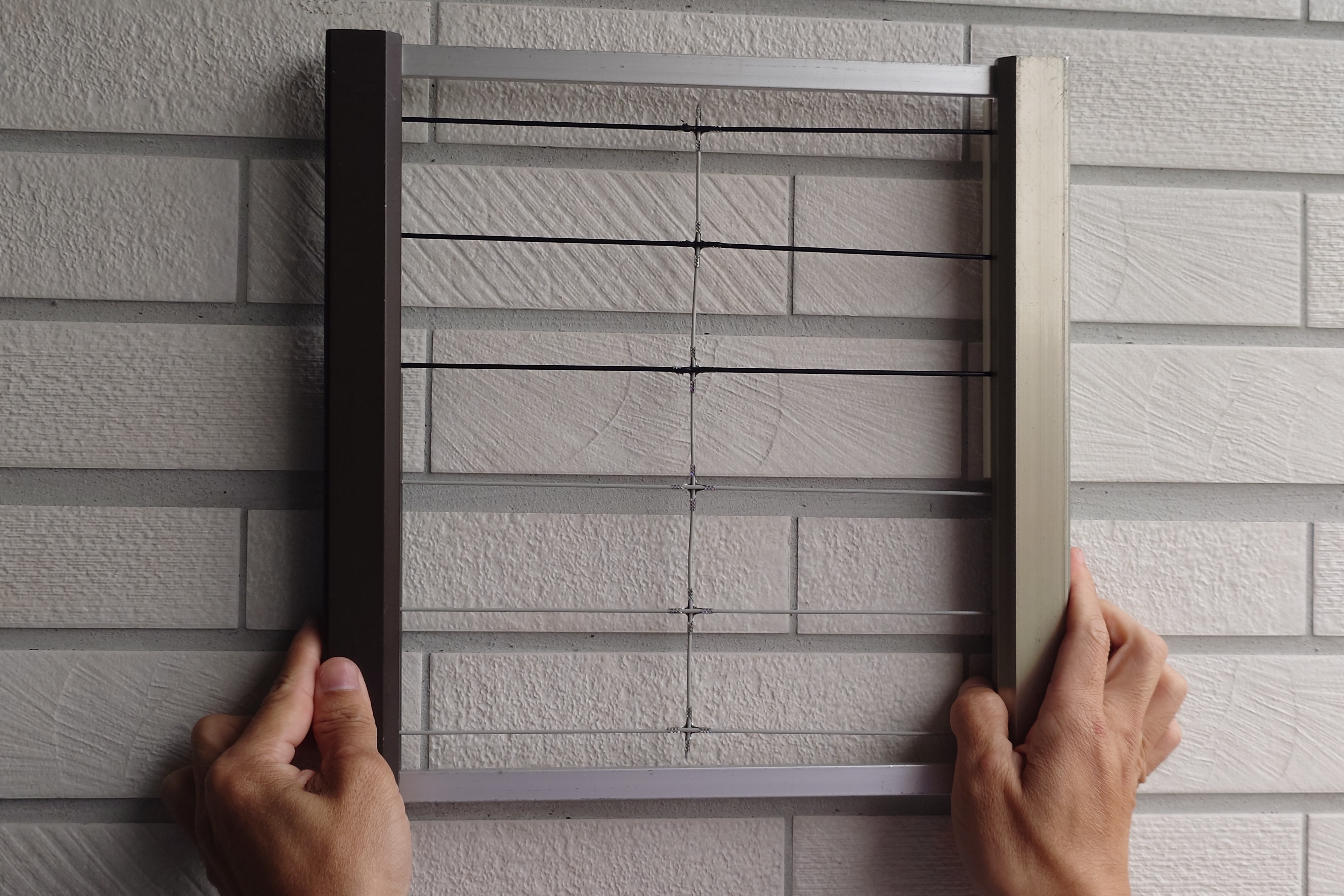 在線材施作的部分,當初防墜網在規劃上除了要 保護家人 也要兼顧 寵物 的安全,因此選用間距離是2.5公分,同時在直線的部分則是打上三條及數個 防貓十字扣 來加固防止屁貓們攀爬鑽出。
