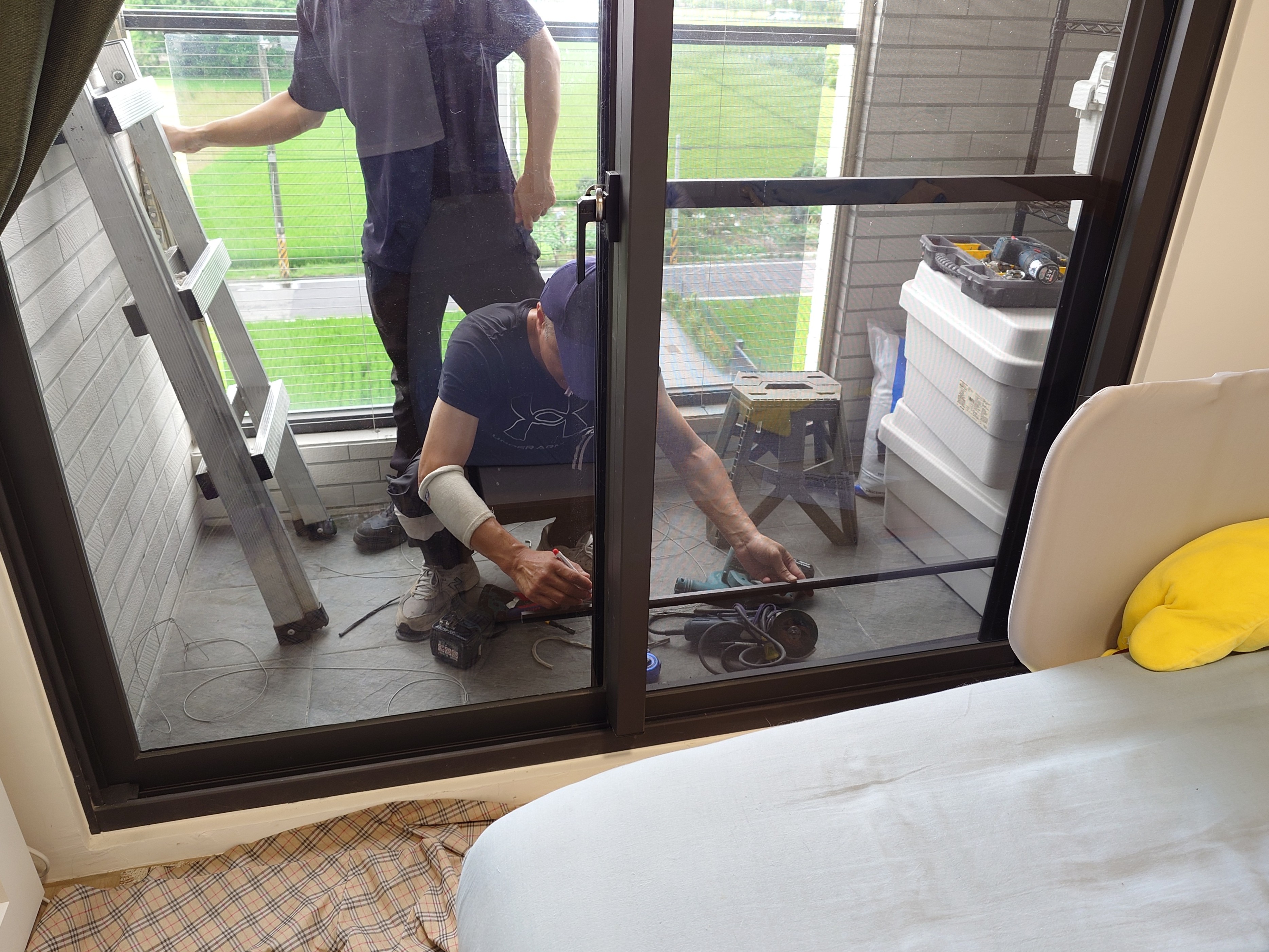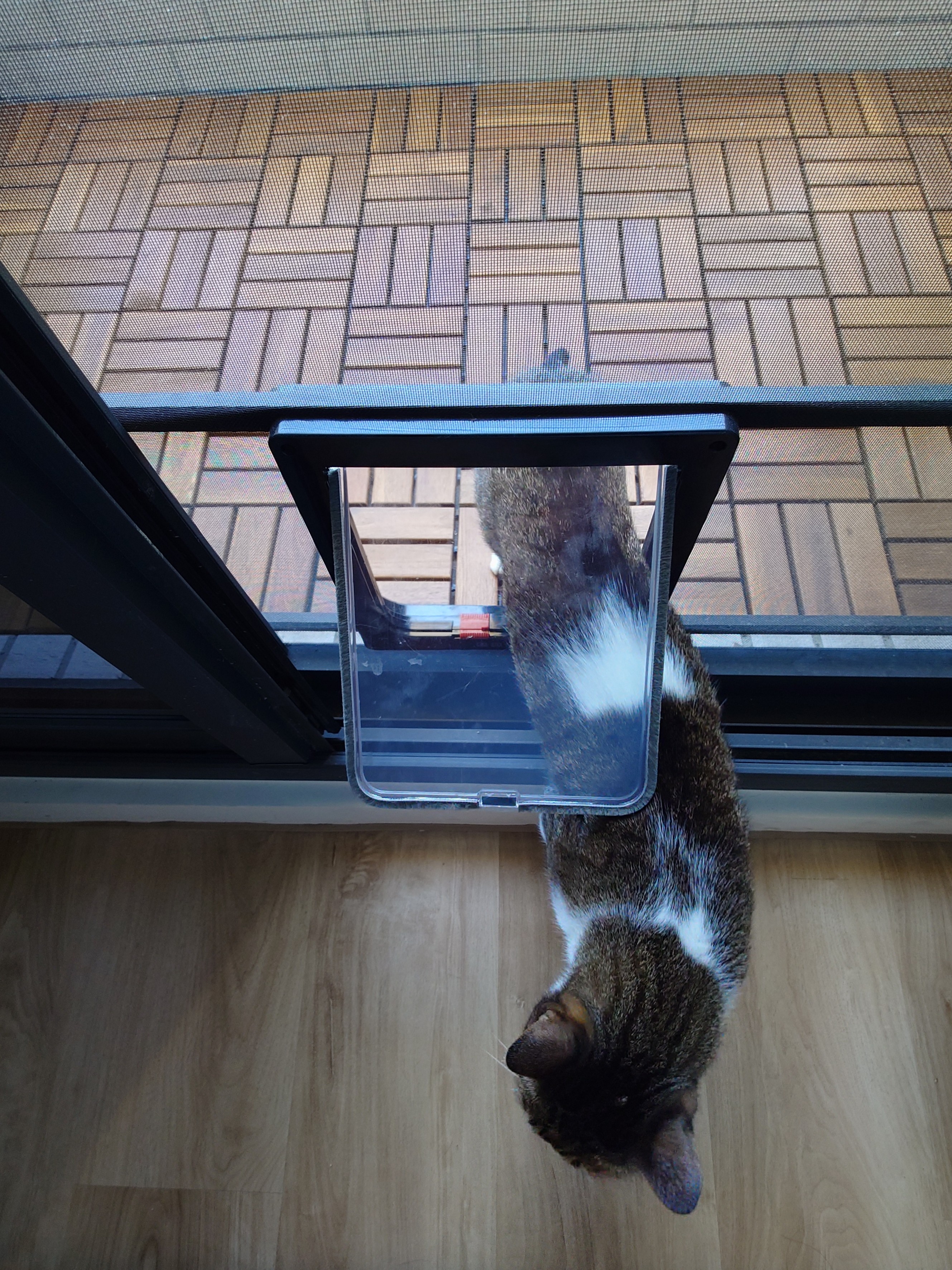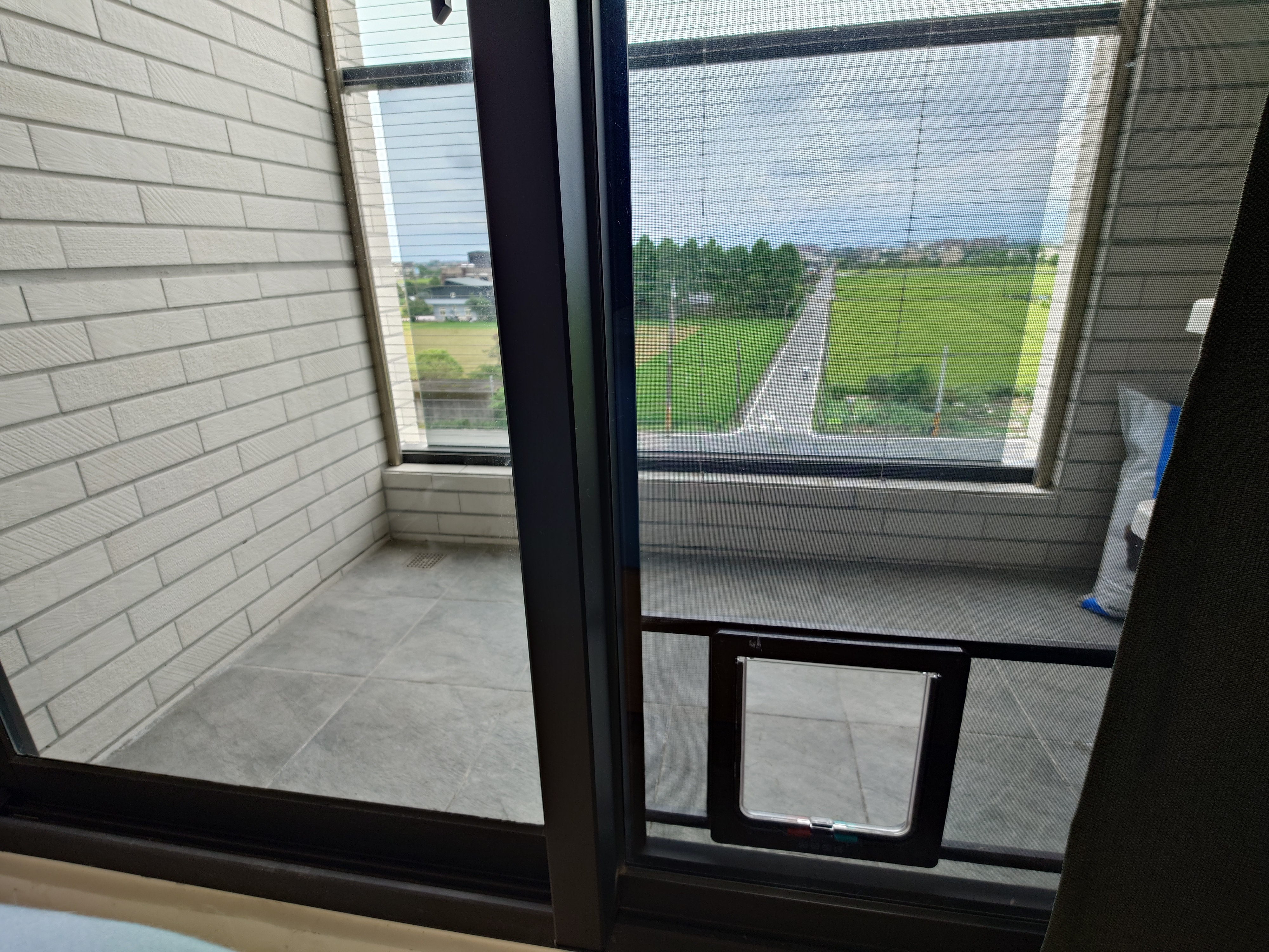 貓門安裝位置的部分,我當下是選擇靠近兩扇玻璃門的交界處,主要可以在平常不想要讓貓進出陽台時,能開一半玻璃門保持室內通風,想讓貓咪出去放風的時候則是全開玻璃門露出貓門即可。