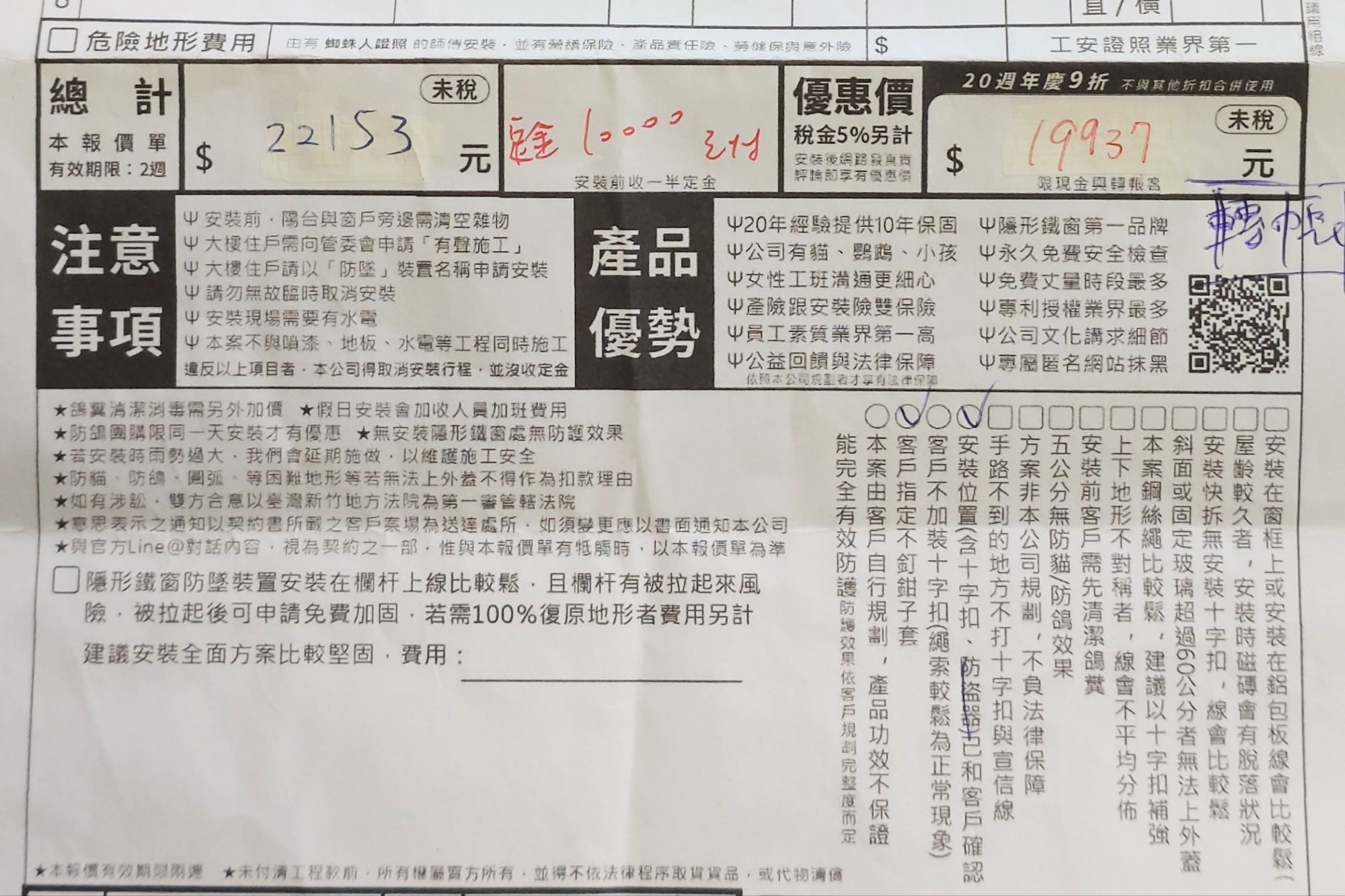 這一次的 防墜網 加 貓門 的施工費用原本評估約2萬2,實際施工後加上目前高高順隱形鐵窗正在20周年慶完工9折優惠活動,最終花費為1萬9千9,並且有提供10年保固服務。