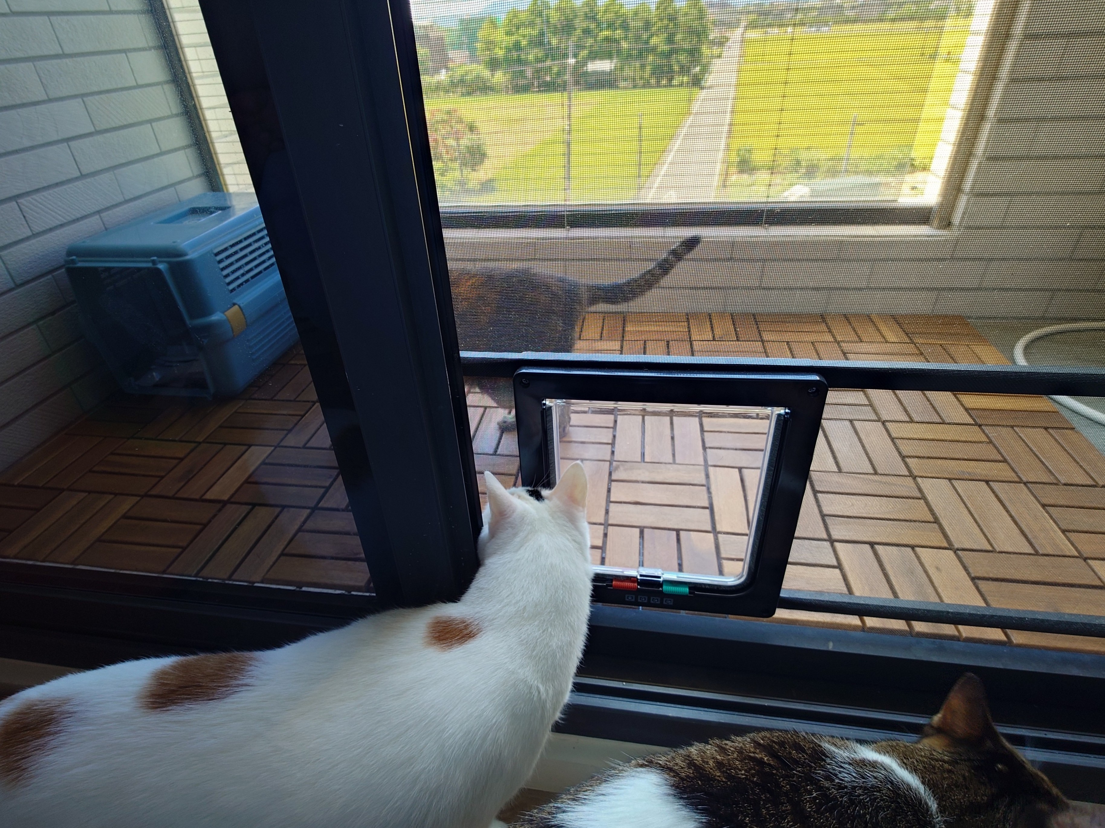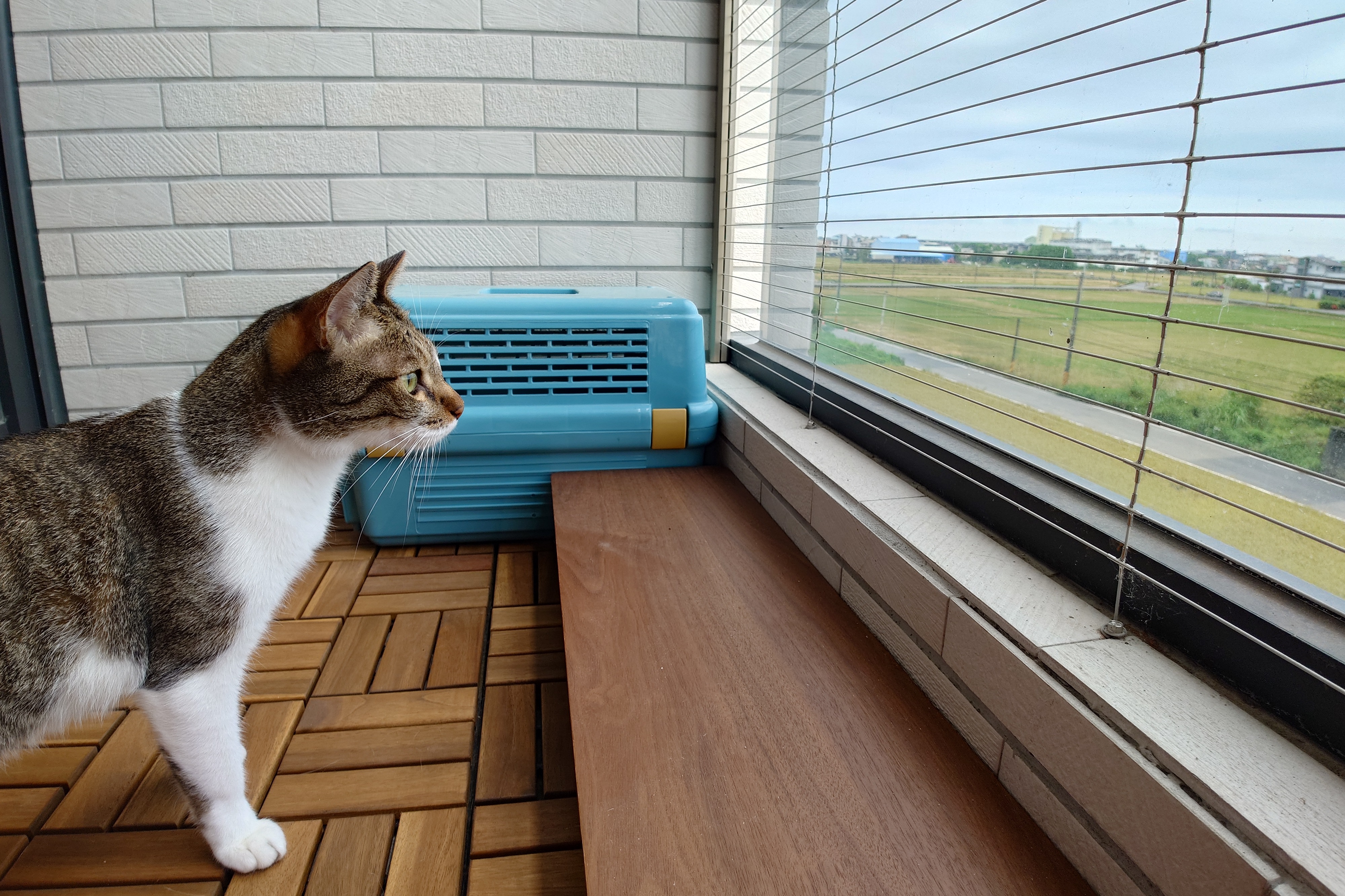 後來把貓提籠拿去外面擺放,再放一些原有家中屁貓們使用的東西在陽台,讓家中三位屁貓老闆們透過氣味的引導,學習用頭頂開貓門進出陽台。