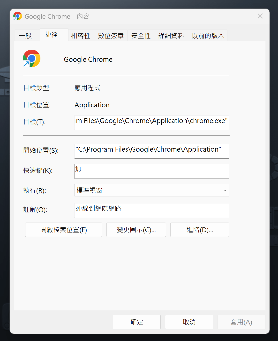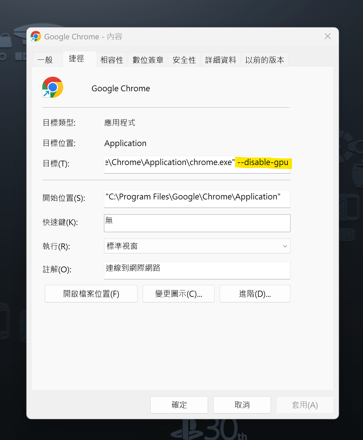接著在目標(T)的地方,連結位置的最後端,如上圖所示,依序在"的後面輸入👉(空白鍵)(兩個-)disable-gpu,接著按下套用,然後確定關閉該頁面。