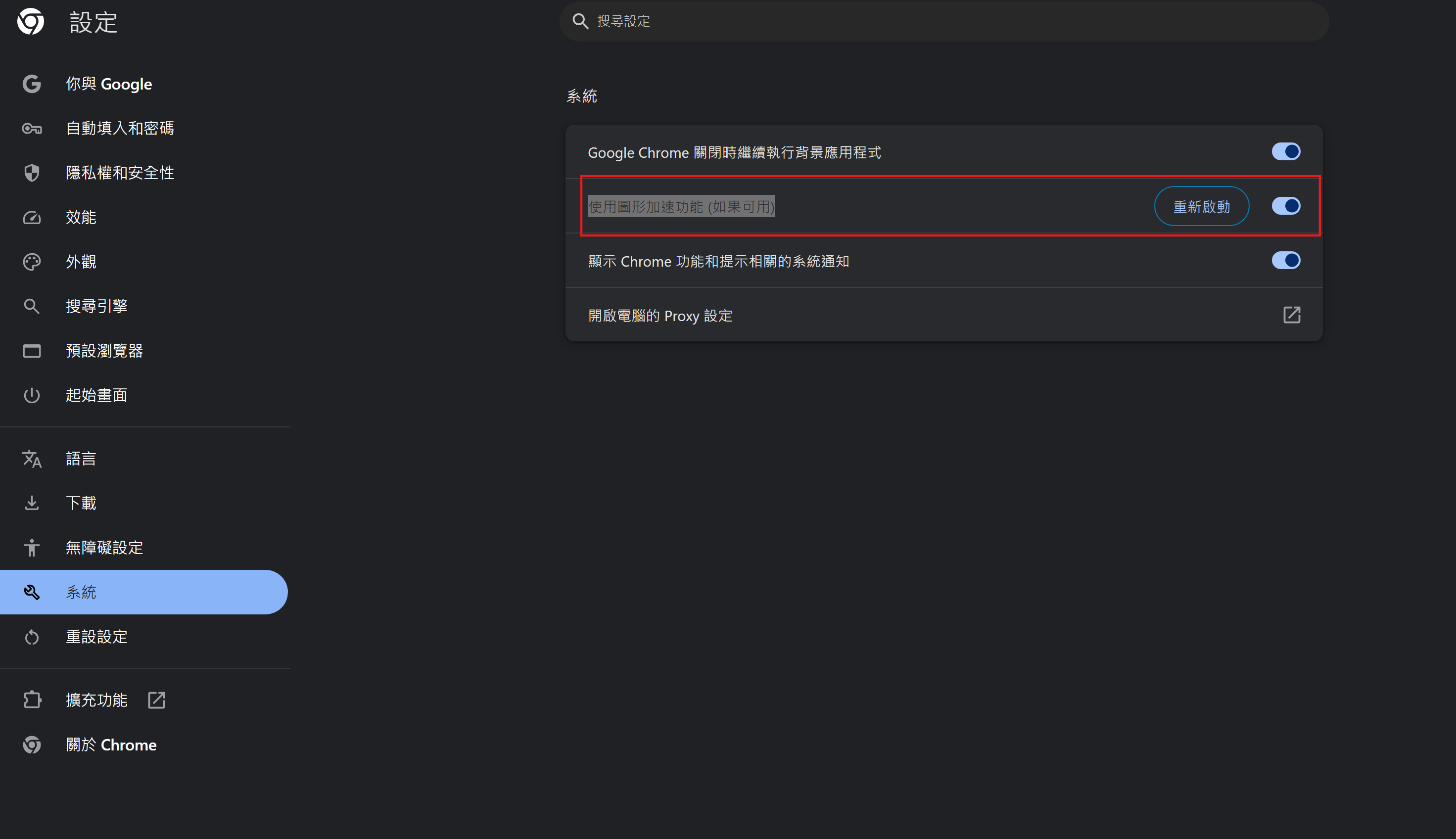 再來就是到瀏覽器的設定 > 系統,把「使用圖形加速功能 (如果可用)」關掉,然後再回去前面步驟把【步驟二】加上去的內容給移除,就能正常使用囉!