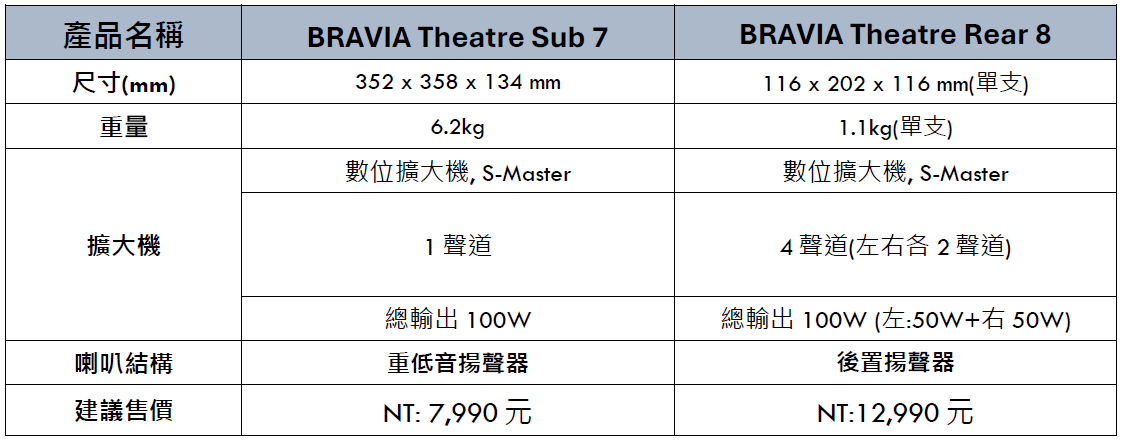 Sony BRAVIA Theater系列配件已於(8/5)在台正式上市,BRAVIA Theatre Sub 7 (SA-SW7) 無線重低音揚聲器建議售價NT: 7,990元,BRAVIA Theatre Rear 8 (SA-RS8) 無線後環繞揚聲器建議售價NT:12,990元。