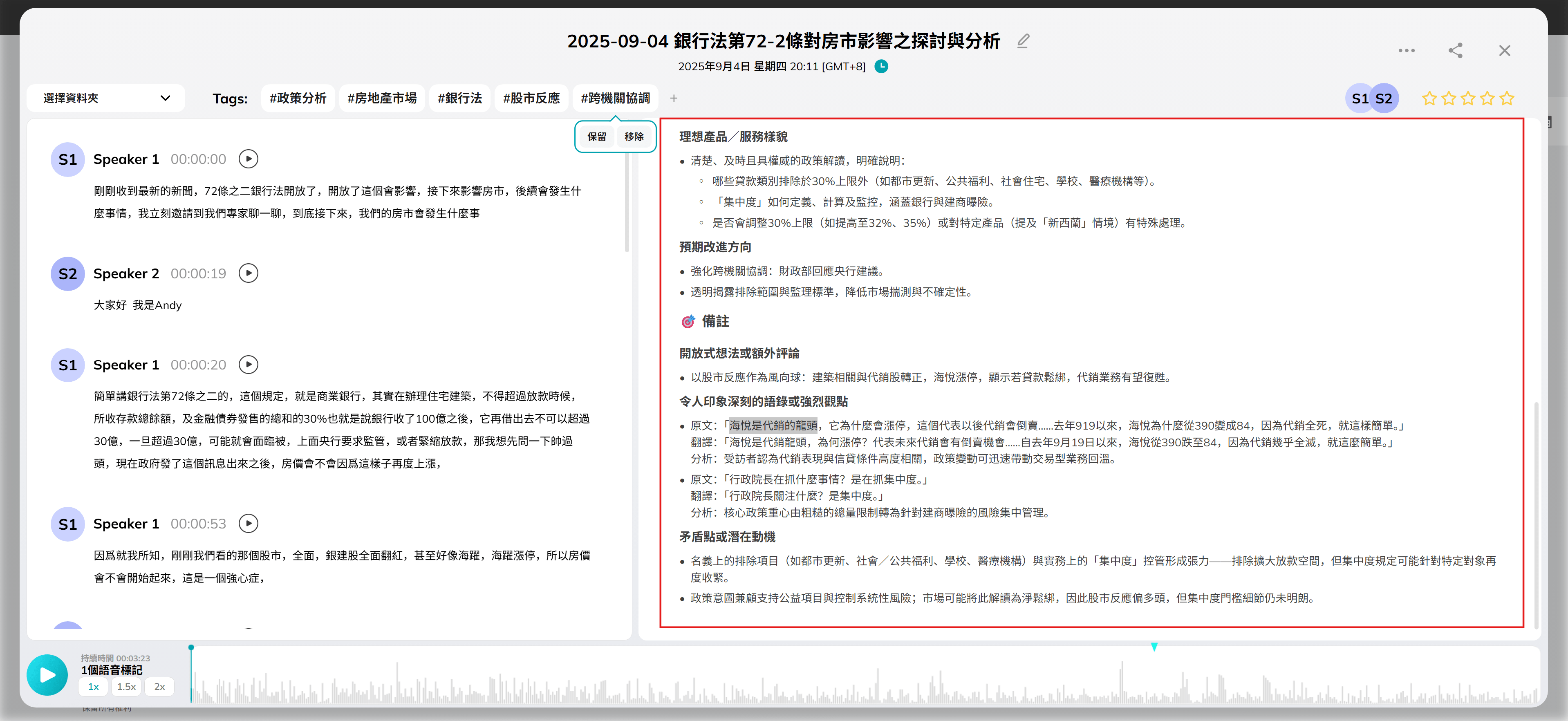 不論是線上或是線下,多人會議記錄往往最麻煩的是後續要花時間仔細聆聽每一個發言者的聲音來判斷是誰發言的內容,不過 HiNotes 的高級會員方案直接幫你解決這個「痛點」。