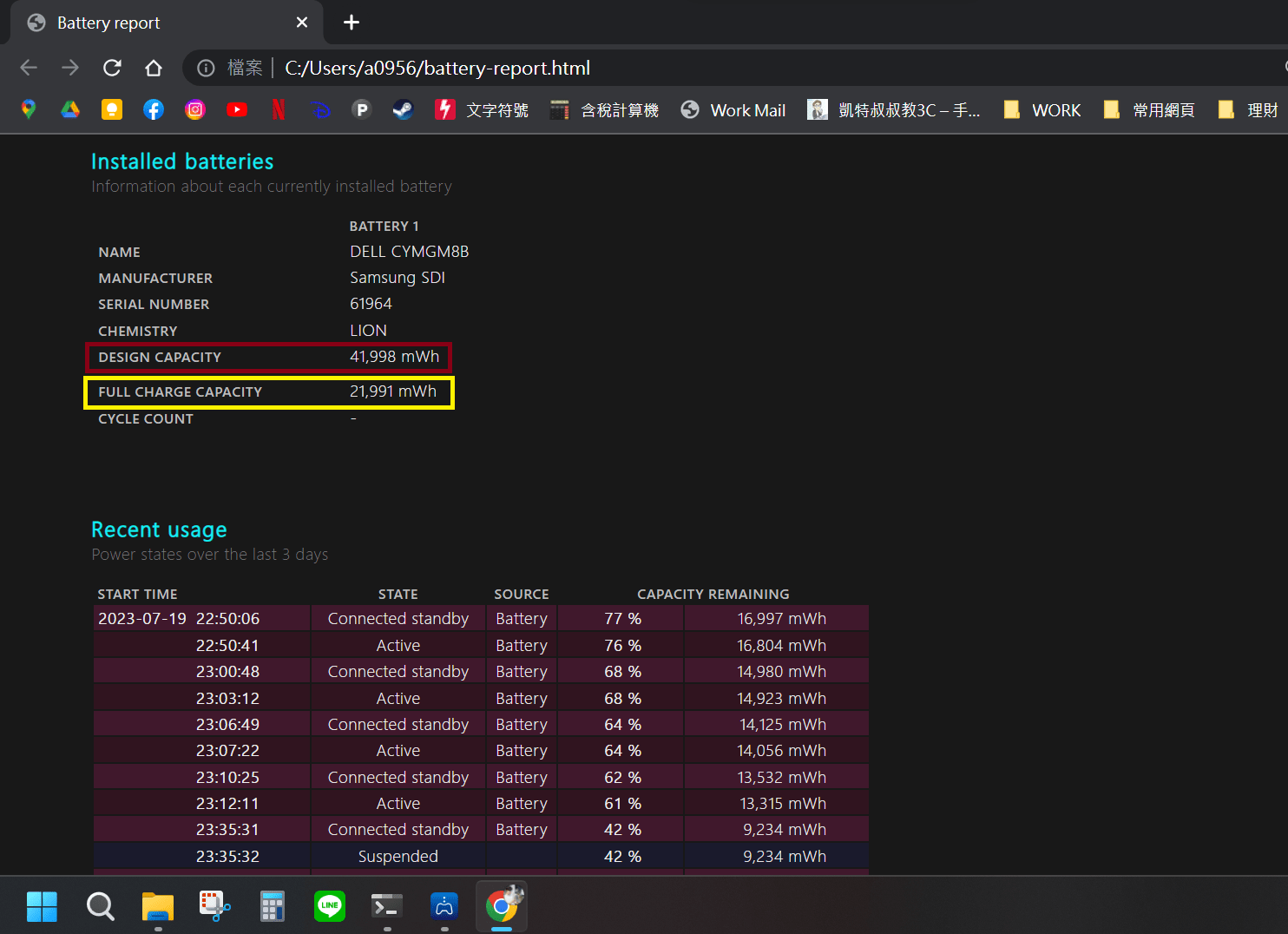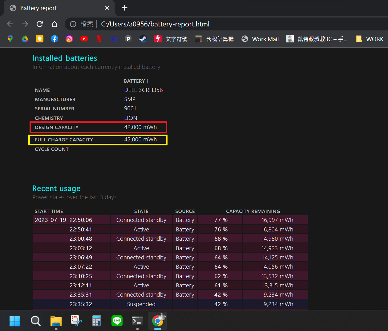 在實際更換筆電的電池後,並且先讓電池充飽電後再進行一次指令查詢,就能看到新電池的Design Capacity 與 Full Charge Capacity 相當於100%。