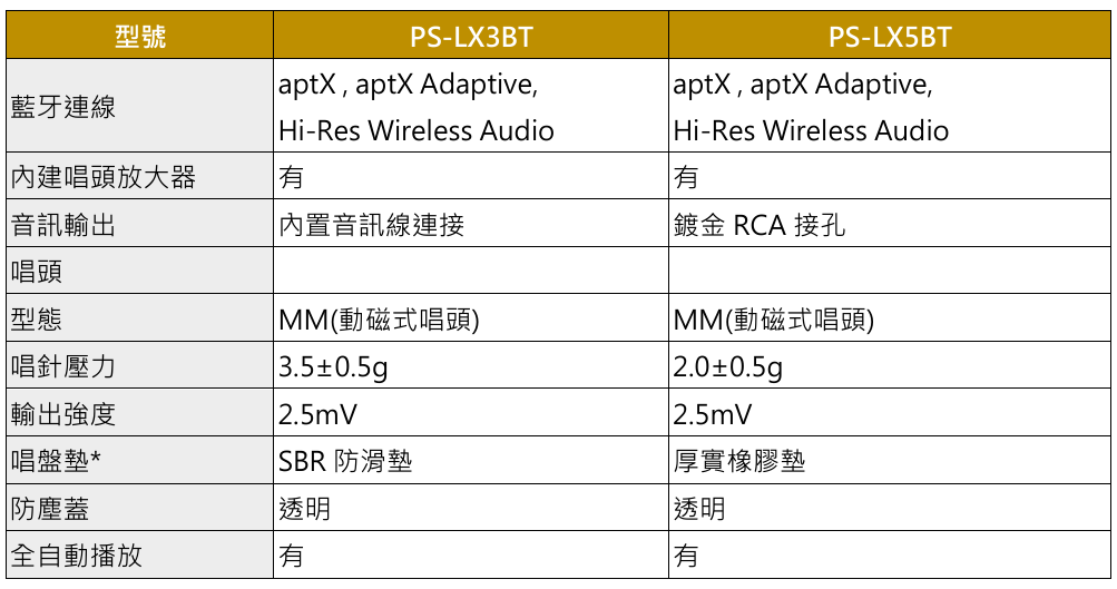 兩款最新黑膠唱盤支援Qualcomm® aptX Adaptive 藍牙編碼技術帶來豐富細節的高解析音質,為這股黑膠熱潮提供優質的設備選擇;PS-LX3BT和 PS-LX5BT可透過藍牙無線連接耳機、喇叭或環繞式音響等配備,搭配一鍵啟動全自動播放的設計,以更簡潔俐落的聆聽方式,讓初試黑膠唱片的樂迷或發燒友都能輕鬆上手、直覺操作,品味黑膠唱片類比訊源獨有的溫潤音質與魅力。